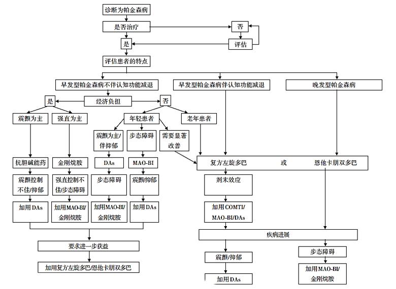 药物治疗的核心就是补充多巴胺,通过药物提高血液中多巴胺的浓度,90%的帕金森病人对药物治疗还是有效的。经典的抗帕金森病药包括拟多巴胺类药和抗胆碱药。前者是通过直接补充多巴胺(DA)前体或抑制DA降解,而后者则通过拮抗相对过高的胆碱能神经功能而缓解症状。其中帕金森药物治疗流程如下图所示。